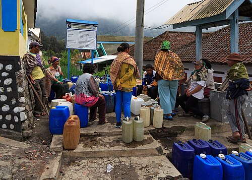 People of Ngadisan (Java, Indonesia) are filling their cans at the village pump. The old well is defunct and replaced by a water tap. [add]