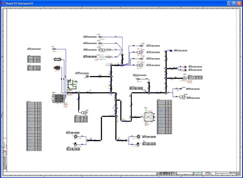 E3.formboard drawings provide a view of the cables and harnesses as defined in the schematic diagram.They comprise both electrical and non-electrical components including connector placement, wire segments, protective coverings, clips, labels etc.