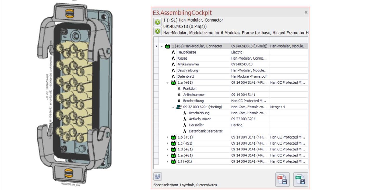 E3.AssemblingCockpit helps the worker in the control cabinet assembly department to select and assemble the individual parts for modular connector assemblies and other components which today have to be assembled from comprehensive parts kits.