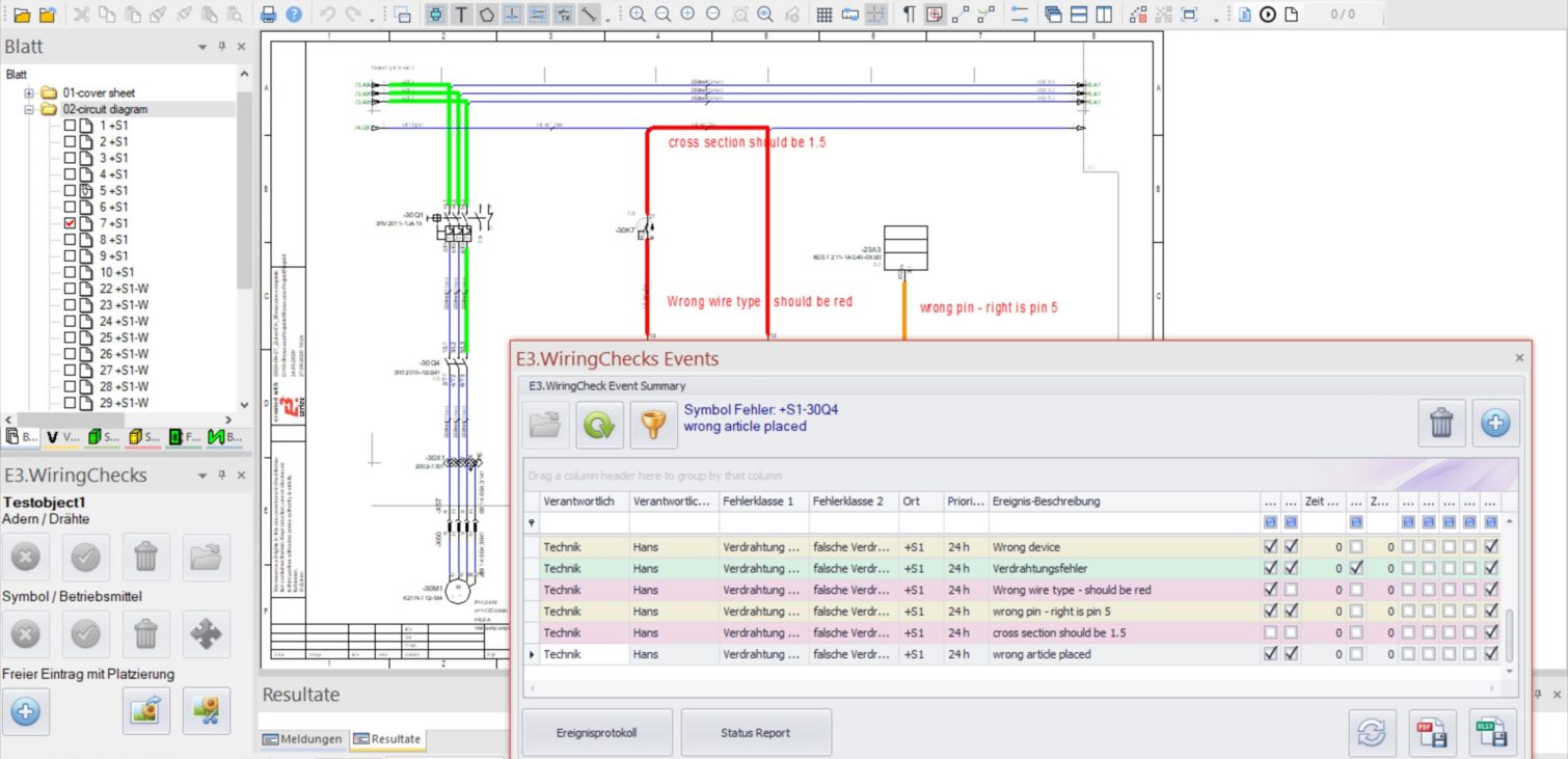 Electrical start-up testing of wires and devices is digitally recorded and marked as checked or fault error. In the event of an error, an incident can be recorded, described, and placed at the appropriate position in the schematic. The error descriptions can be accessed by all relevant departments, from engineering to production, and the events assigned to them can be called up and processed. In this way, it is ensured at all times that error correction and subsequent checks can be processed in a targeted manner.