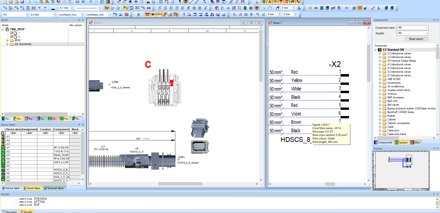The device tree represents the online bill of materials while working. It is permanently up to date and can be output in various formats (Excel, ASCII, XML or on graphic sheets at any time. E3 offers predefined reports and documents such as tables of contents, parts lists, connection lists, cable lists and terminal diagrams. Data can also be exported from E3.series in any format via an integrated programming interface (API). The API is based on Microsoft’s COM technology (COM interface).