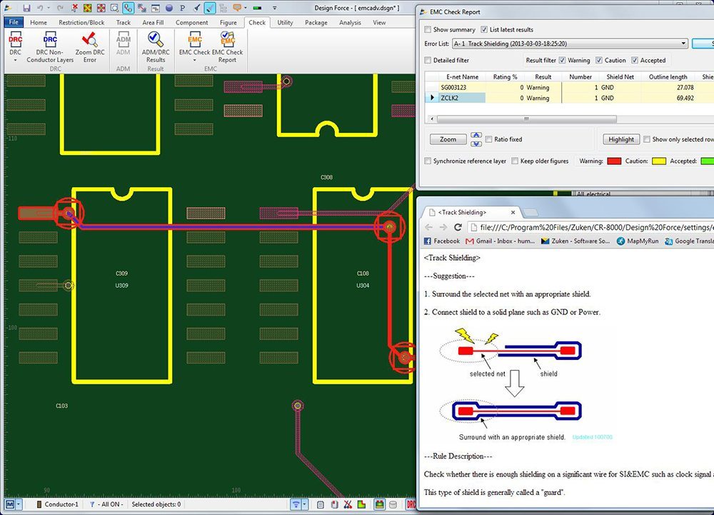 With EMC Adviser for CR-8000, the circuit engineer is able to categorize EMC-relevant signals early-on in the schematic phase. The appropriate EMC rules are selected for the application and applied during the design phase, such as a DRC check.